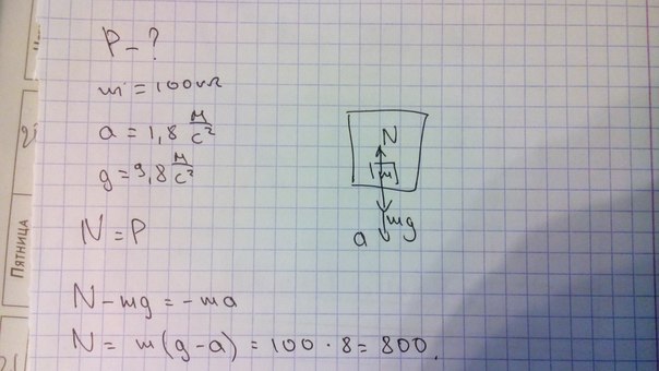 каков вес тела массой 100 кг в лифте поднимающемся вверх и тормозящем с ускорением 1.8 м/с^2.? ускорение свободного падения считать равным 9.8 м/с^2