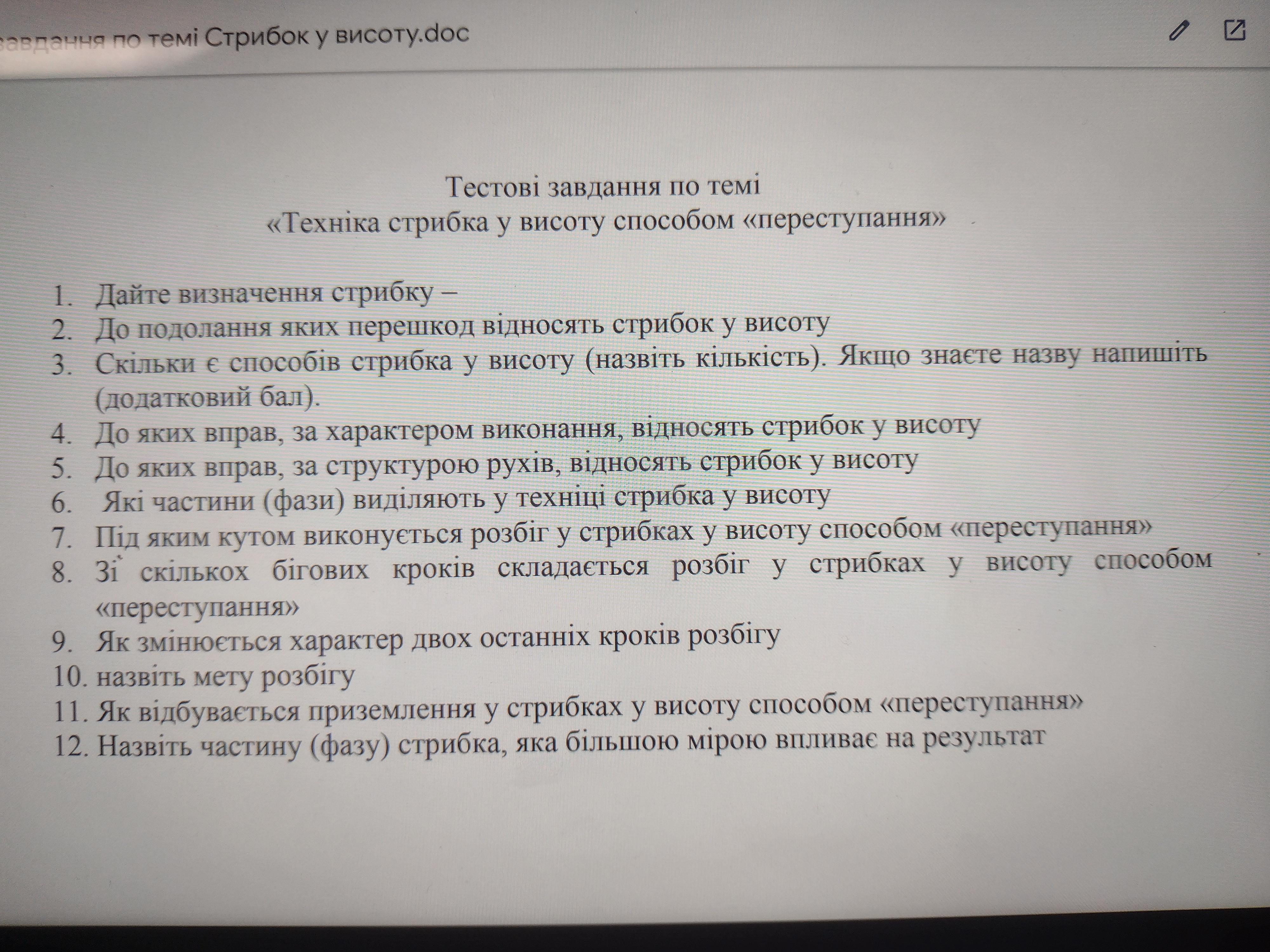 1) Стрибки у висоту — вид легкої атлетики, в якому спортсмени змагаються в тому, щоб перестрибнути через поперечку, встановлену на певній висоті над землею, не збивши її.