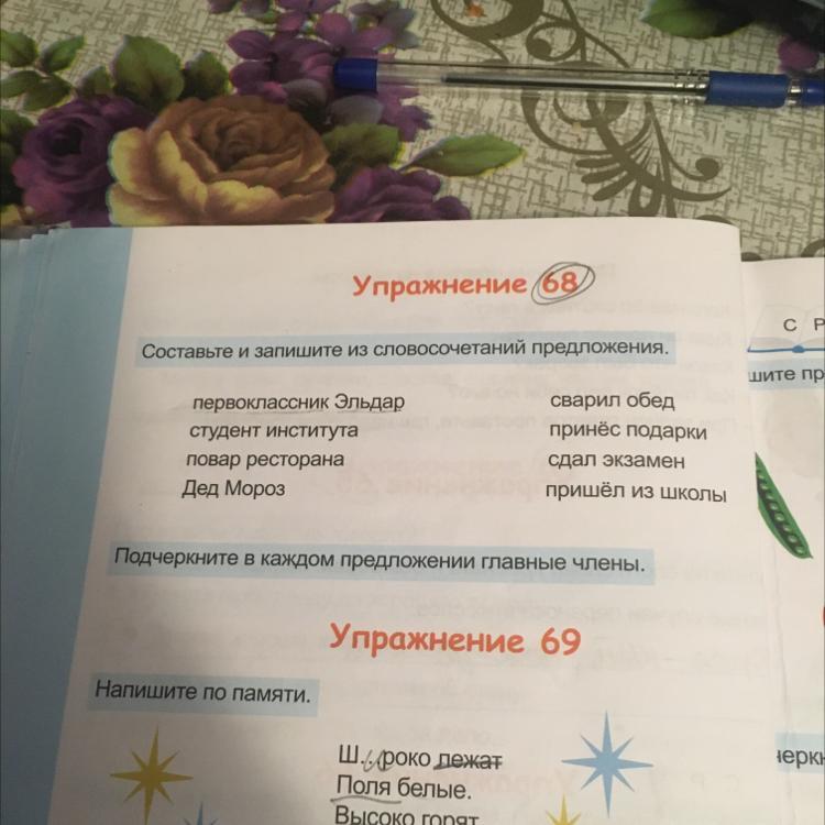 Первоклассник Эльдар пришел из школы. Студент института сдал экзамен. Повар ресторана сварил обед.дед мороз принес подарки