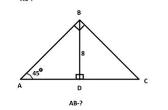 угол ADB= 90. угол BAD = 45.значит угол AND = 45.Против равных сторон лежат равные углы в треугольнике. значит, если BD =8, то A D =8. и AB находится по теореме Пифагора. AB= √64+64=√128