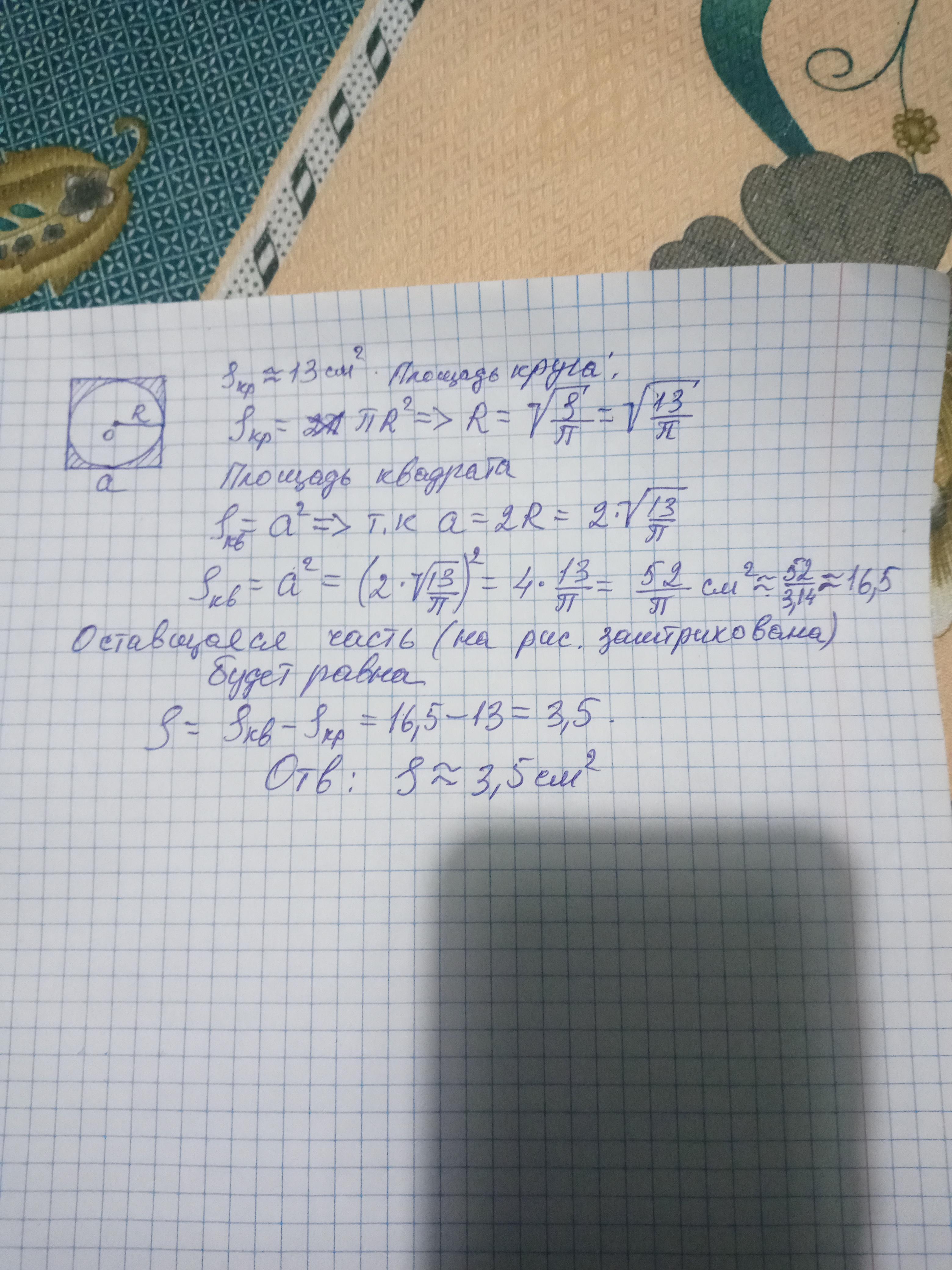 Площадь круга около 13 см². Сделайте необходимые замеры и вычислите общую площадь остальных частей квадрата вне круга.