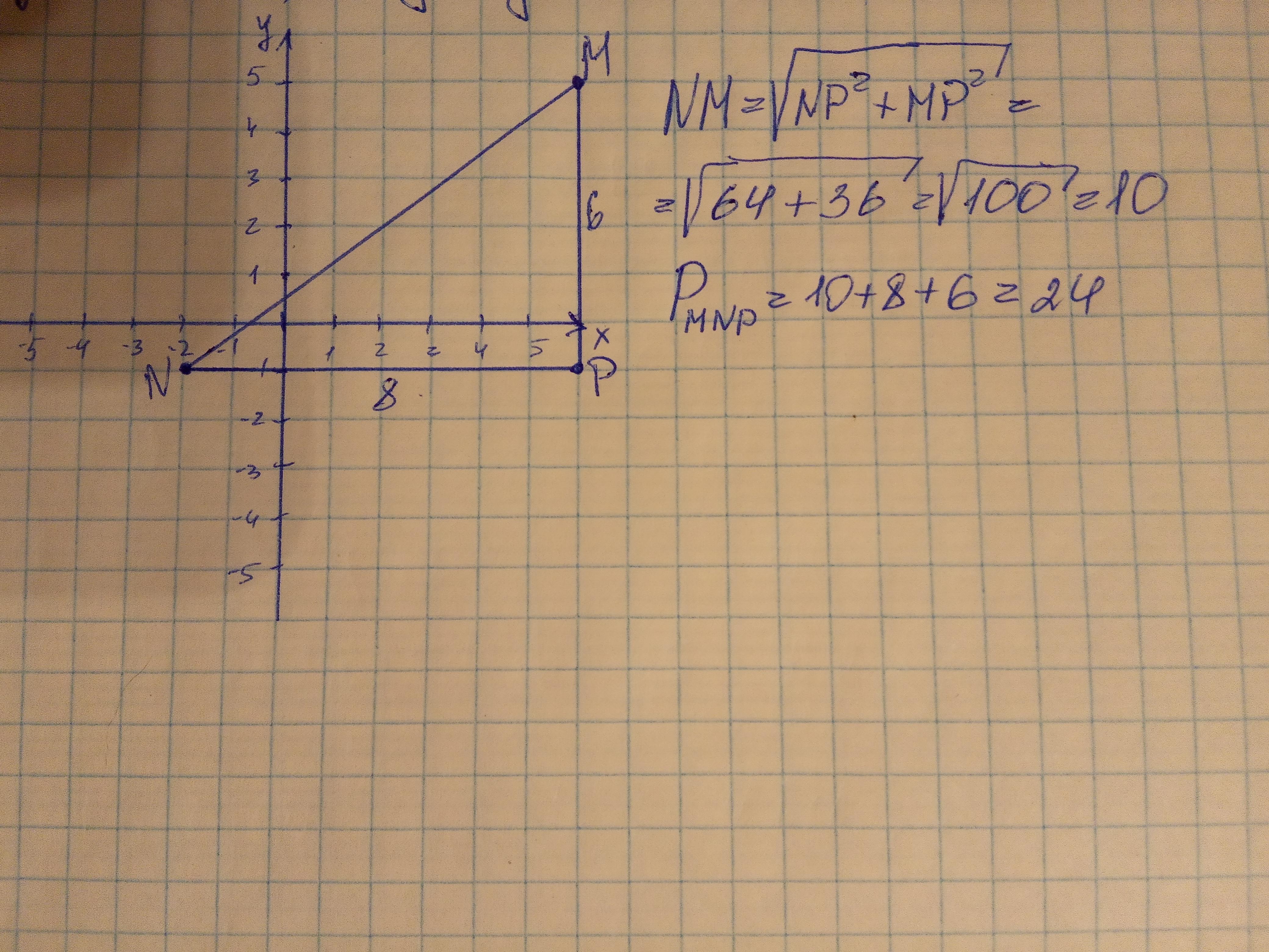 Найдите периметр треугольника MNP, вершины которого имеют координаты: M(6; 5), N (-2; -1), P (6; -1).