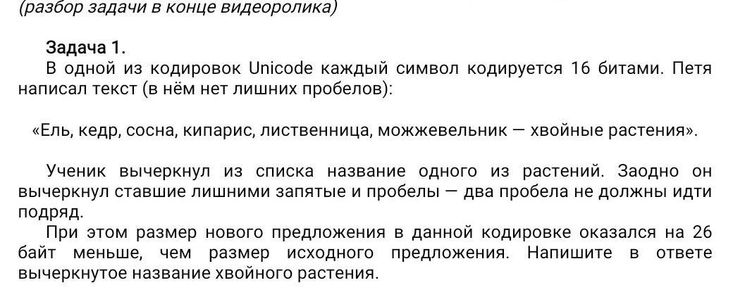 на 26 байт меньше,с учетом того что в 1 байте 8 бит,то сообщение стало меньше на 208 бит. 1 символ кодируется 16 битами, значит вычеркнули 208/16=13 символов. Под это условие подходит только слово "лиственница+запятая+пробел"