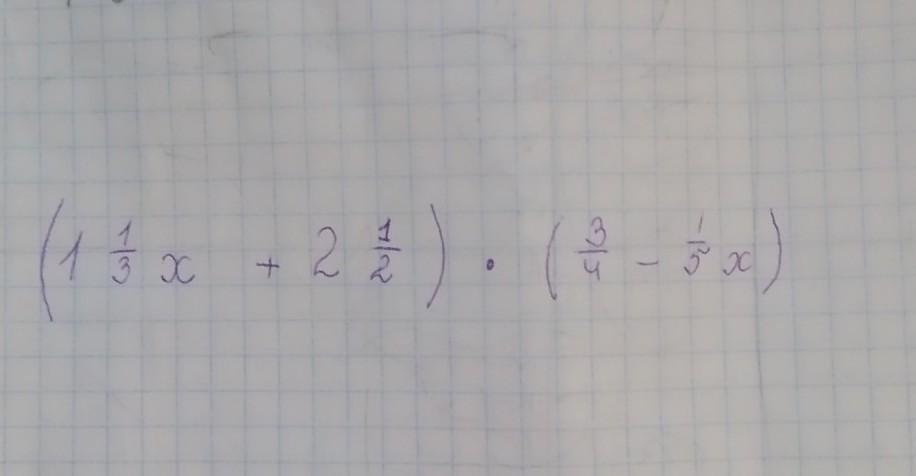 (1 1/3 * x + 2 1/2)(3/4 - 1/5 * x) = (4/3 * x + 5/2)*(3/4 - 1/5*x) = x - 4/15*x² + 15/8 - 1/2*x = -4/15*x² + 1/2*x + 15/8