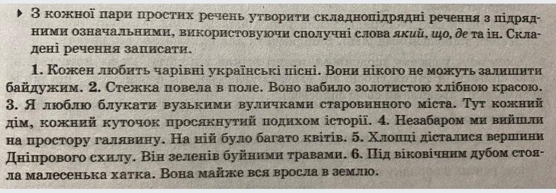 2 стежка повела в поле щоб воно вбивало золотистою хлібною красою. 3 я люблю блукати вузькими вуличками старовинного міста тому що тут кожний дім, кожний куточок просягнутий подихом історії.4 незабаром ми вийшли на простору галявину де на ній було багато квітів 5 хлопці дісталися вершини Дніпровського схилу який зеленів буйними травами 6 Під віконечком дубом стояла малесенька хатка яка майже вся виросла в землю