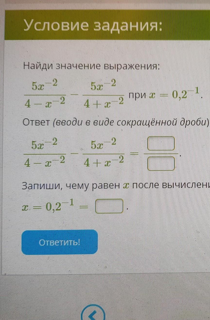 Объяснение: 5х⁻²/(4-х⁻²) - 5х⁻²/(4+х⁻²) = 10х⁻⁴/(16-х⁻⁴)=10/9999