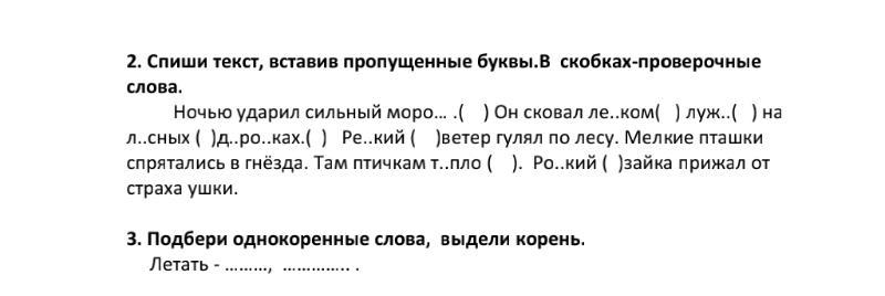 Ночью ударил сильный мороз(морозы). Он сковал ледком(льдина) лужи на лесных (лес) дорожках(дорога(проверка согл. ж) , запомнить(проверка глас. о). Резкий(резок) ветер гулял по лесу. Мелкие пташки спрятались в гнезда. Там птичкам тепло(тёплый). Робкий(робок) зайка прижал от страха ушки.