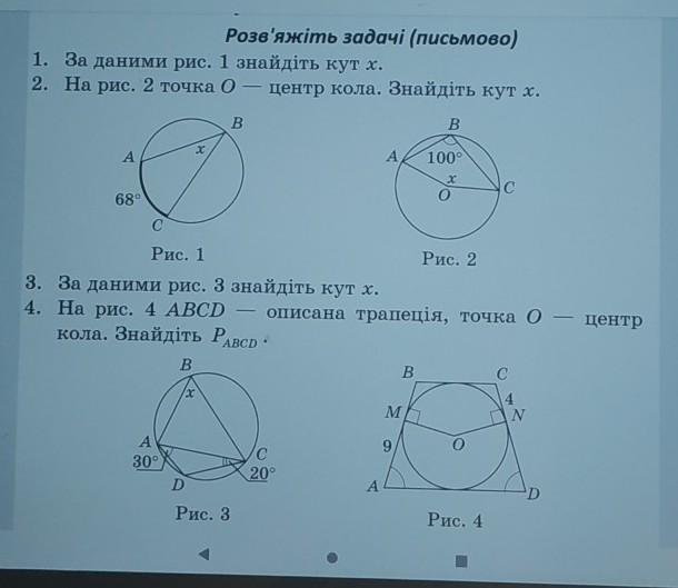 1. кут х = 34°, оскільки вписаний кут дорівнює половині дузі, на яку він спирається.