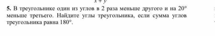 пусть один угол = х° ⇒ второй 2х°, третий (х+20)°