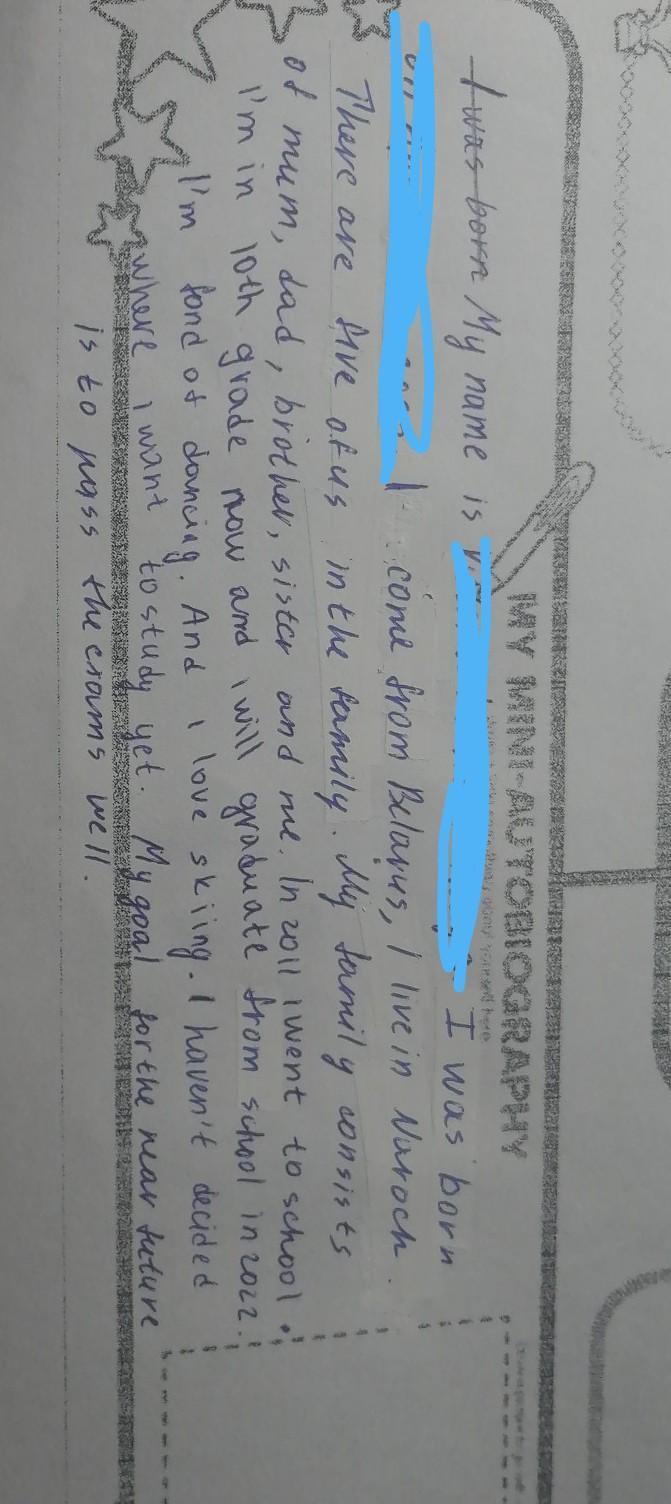 My family consists of a mum, a dad, a brother, a sister and me. I'm in the 10th grade now... I haven't decided yet where I want to study. My aim for the nearest future is to pass exams well.