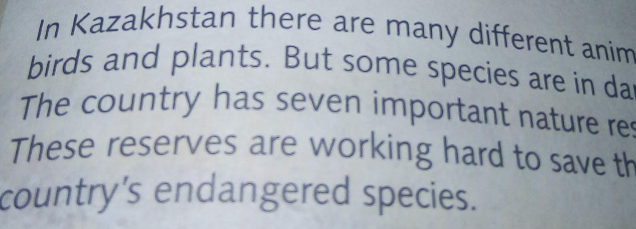 Ин Казахстан зер ар мэни диферент энималс,бёрдс энд плэнтс.Бат сам спишиз ар ин дэнджер. Зе каунтри хас севен импортант нэйчур ресёрвс. Зис ресёрвс ар уоркинг хард ту сэйв зе каунтри'с индэнджэред спишиз