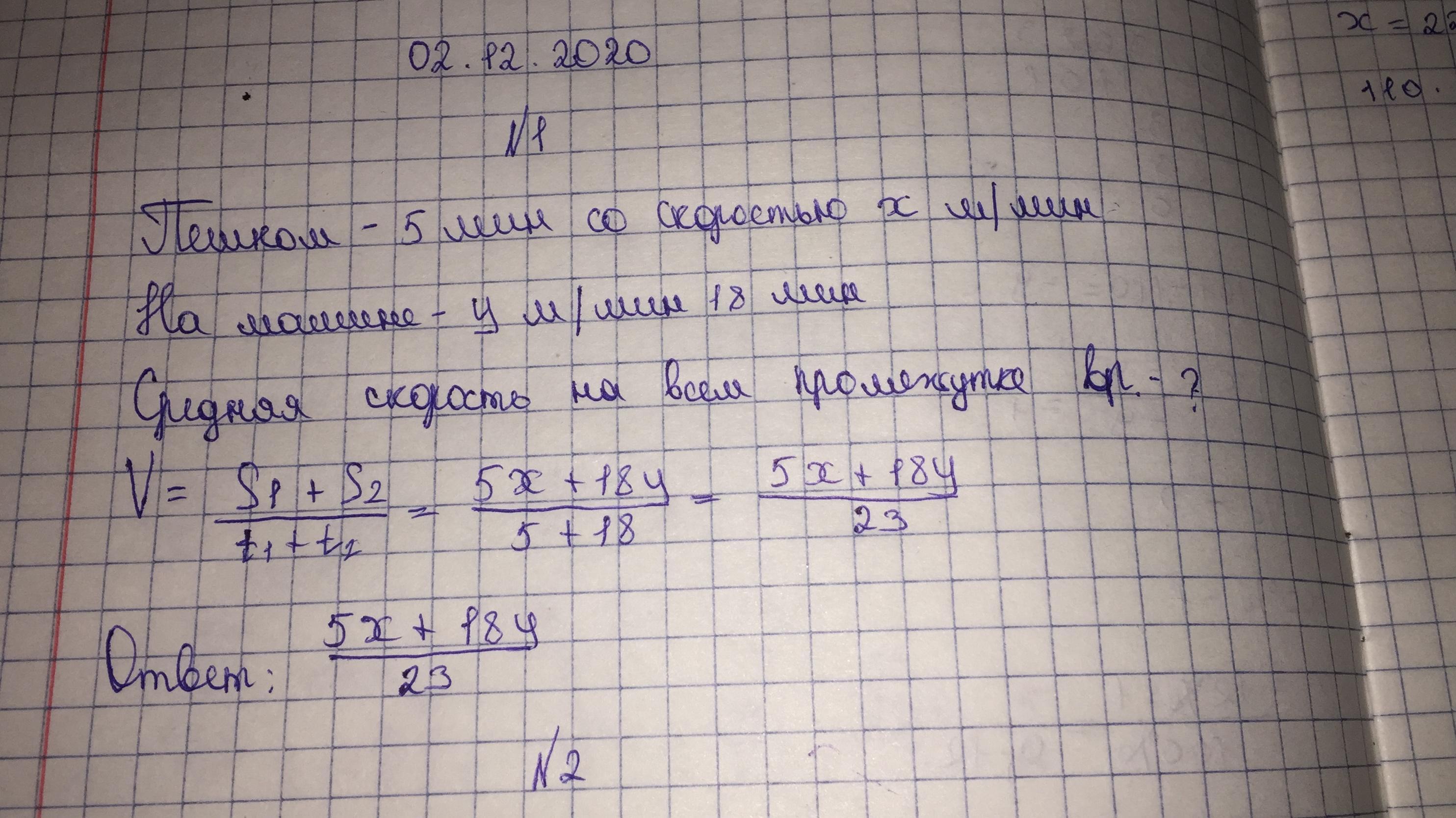 Алмаз идет пешком 5 минут со скоростью х м/мин, затем на машине у м/мин 18 минут. Найдите среднюю скорость Алмаза на всем промежутке пути.