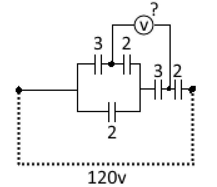 Имеется вот такая цепь. Ёмкость конденсаторов указана над ними. Между началом и концом цепи(там где пунктирная линия) напряжение 120v. Нужно найти напряжение на каждом конденсаторе и показание вольтметра, над которым указан вопросительный знак