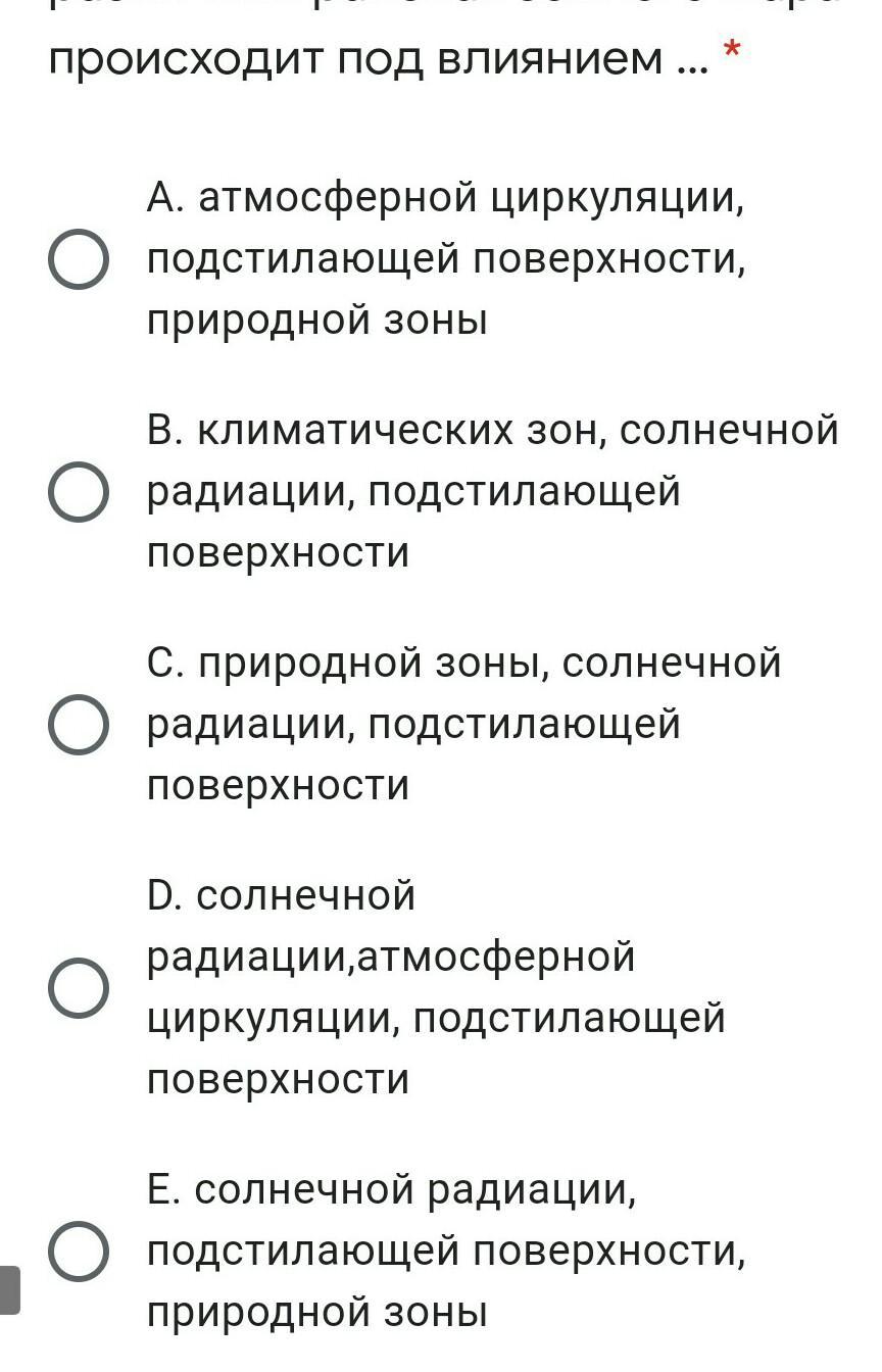 .Укажите правильный ответ. Формирование климата в различных районах земного шара происходит под влиянием … *