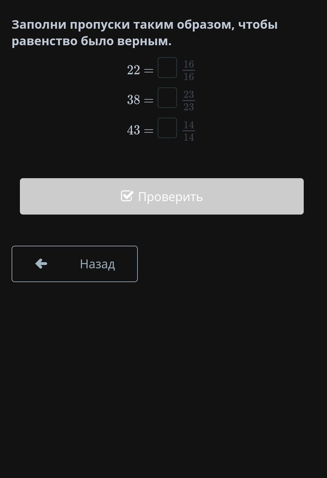 Если числитель дроби равен знаменателю, то такая дробь равна 1.