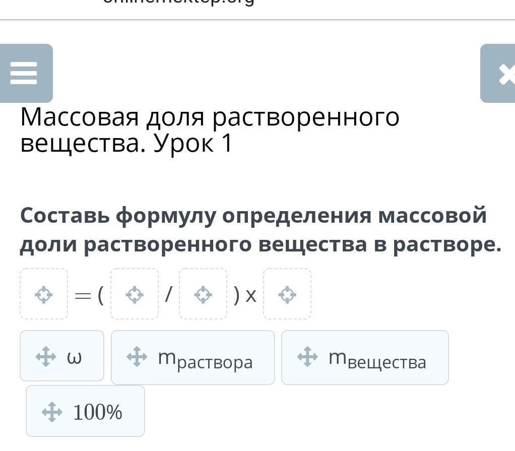 Массовая доля выражается в долях единицы (изменяется от 0 до 1) или в процентах (изменяется от 0 до 100 %). Формула для вычисления массовой доли в процентах: w ( в − ва ) = m ( в − ва ) m ( р − ра ) ⋅ 100 %.