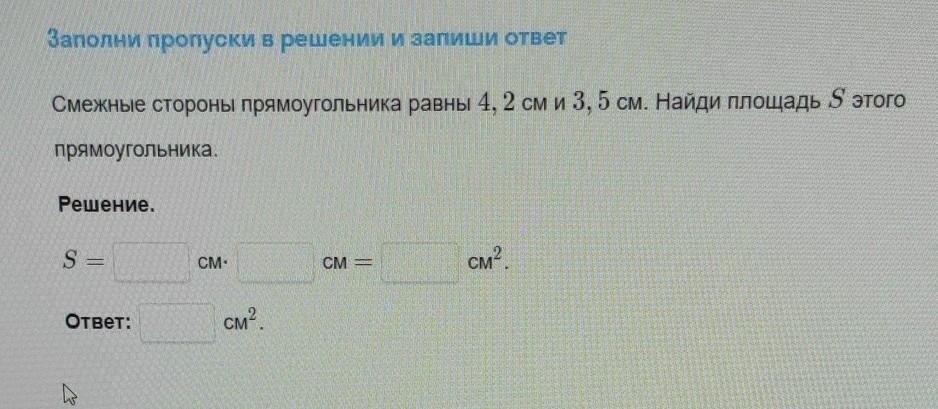 Смежные стороны прямоугольника равнь 4, 2 см и 3, 5 см. Найди площадь S этого