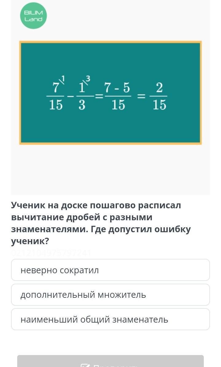 Ученик на доске пошагово расписал вычитание дробей с разными знаменателями. Где допустил ошибку ученик?