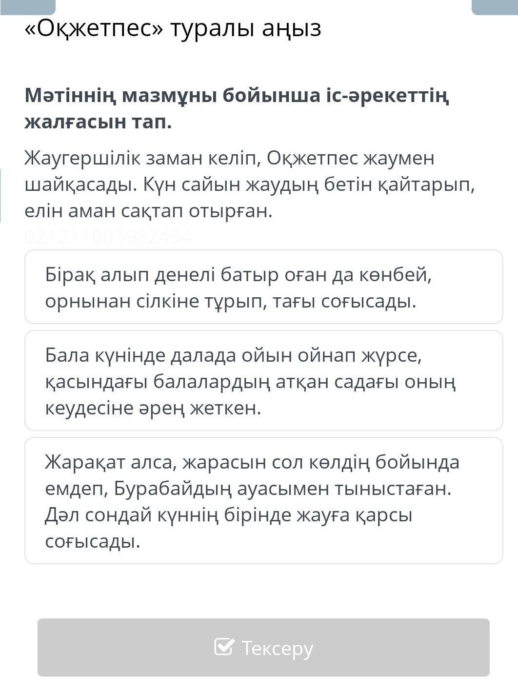 Бірақ алып денелі батыр оған да көнбей, орнынан сілкіне тұрып, тағы соғысады.
