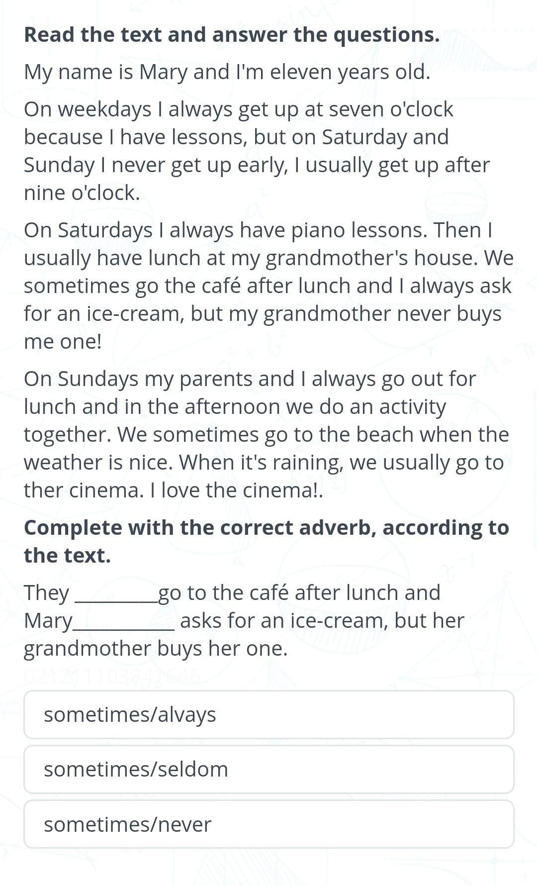 They sometimes/never go to the cafe after lunch and Mary sometimes/always asks for an ice crean , but her grandmother buys her one
