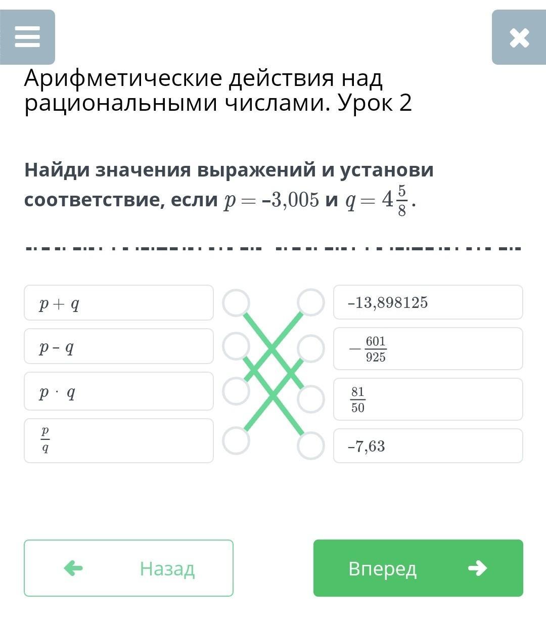 Найди значения выражений и установи соответствие, если р= -3, 005 и q = 4 5/8.