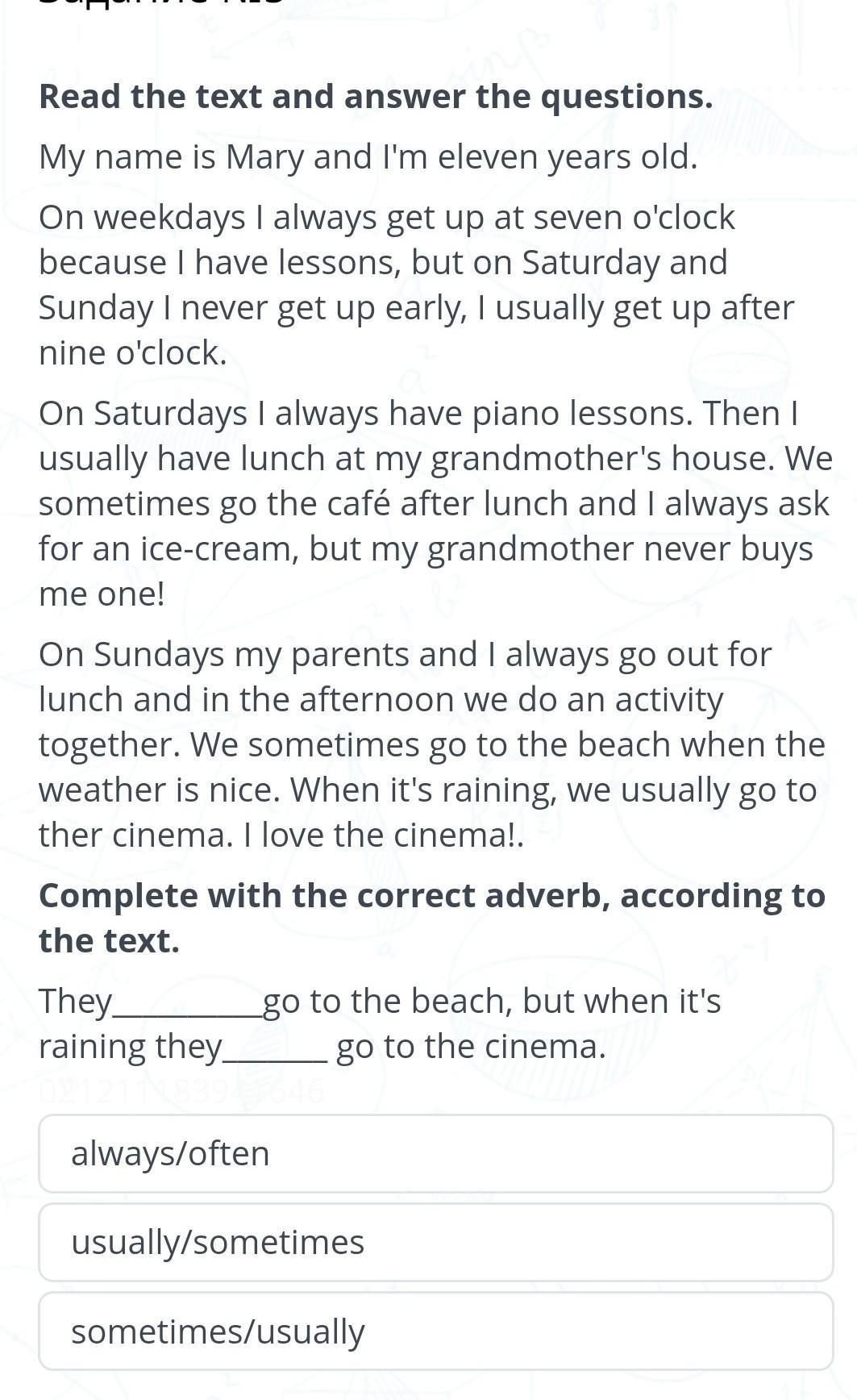 On Saturdays I always have piano lessons. Then I usually have lunch at my grandmother's house. We sometimes go the café after lunch and I always ask for an ice-cream, but my grandmother never buys me one!