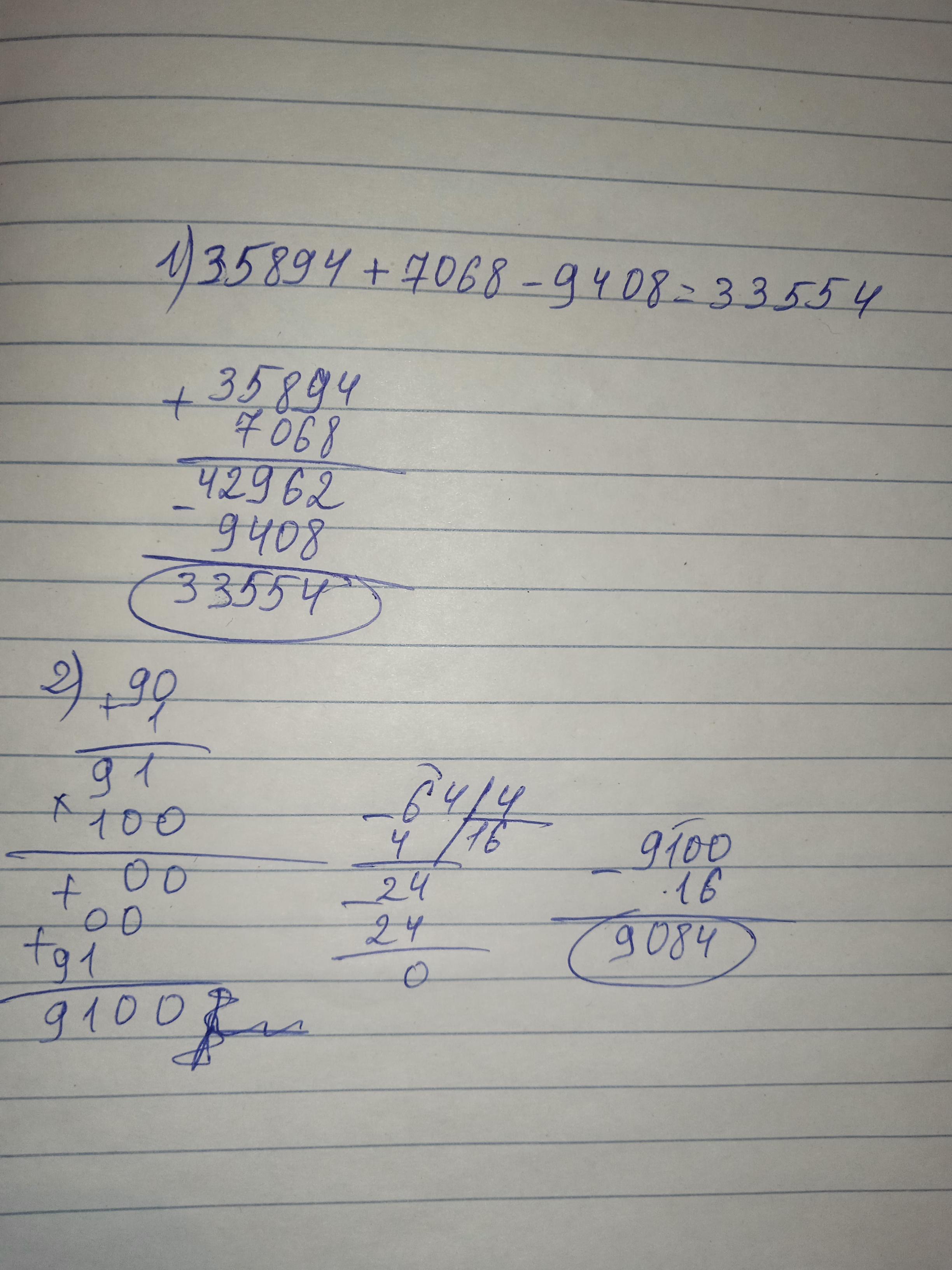 решите примеры столбиком 35894+7068-9408=? (90+1)×100-64:4=? 98888+(60100-8302)=? 90+1×(100-64):4=?