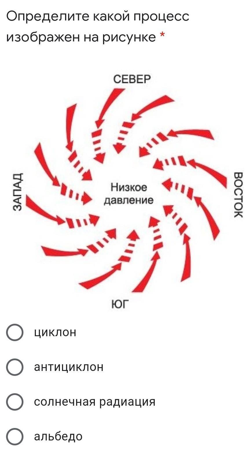 На рисунке изображён циклон, так как в центре показана область низкого давления, циркуляция воздуха происходит против часовой стрелки (в Северном полушарии), воздух идёт от краёв к центру циклона и поднимается вверх.