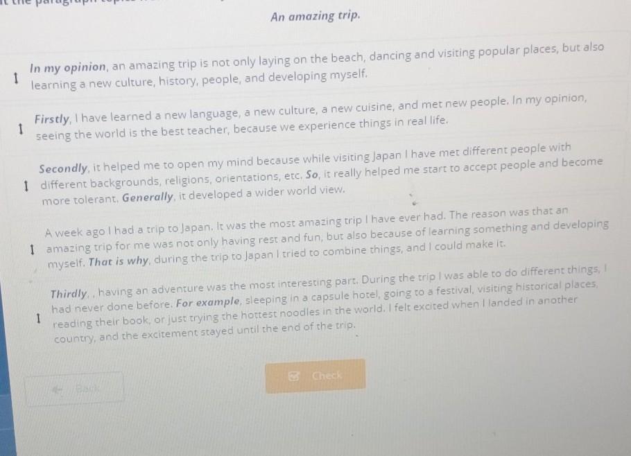 1) A week ago I had a trip to Japan. It was the most amazing trip I have ever had. The reason was that an amazing trip for me was not only having rest and fun, but also because of learning something and developing myself. That is why, during the trip to Japan I tried to combine things, and I could make it.