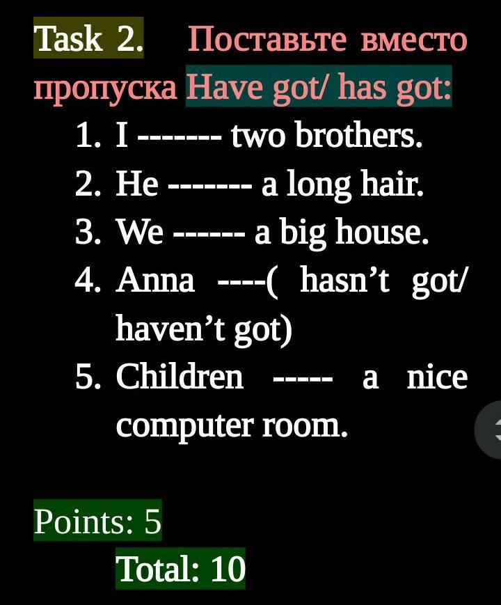 Task 2. Поставьте вместо пропуска Have got/ has got:
