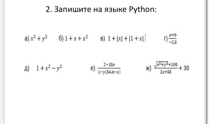 a) (x*x)+(y*y) b) 1+x+(x*x) г) (a+b)/(-2,5) д) 1+(x*x)-(x*x) е) (2-10*x)/(1-y(54,6-x)) Ж) import math
