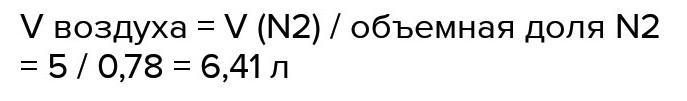 V воздуха = V (N2) / объемная доля N2 = 5 / 0,78 = 6,41 л