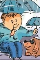 Ответ:мальчик сидит под дождём с зонтиком. Рядом с ним сидит бобка.Они вместе разговаривают о чем то.