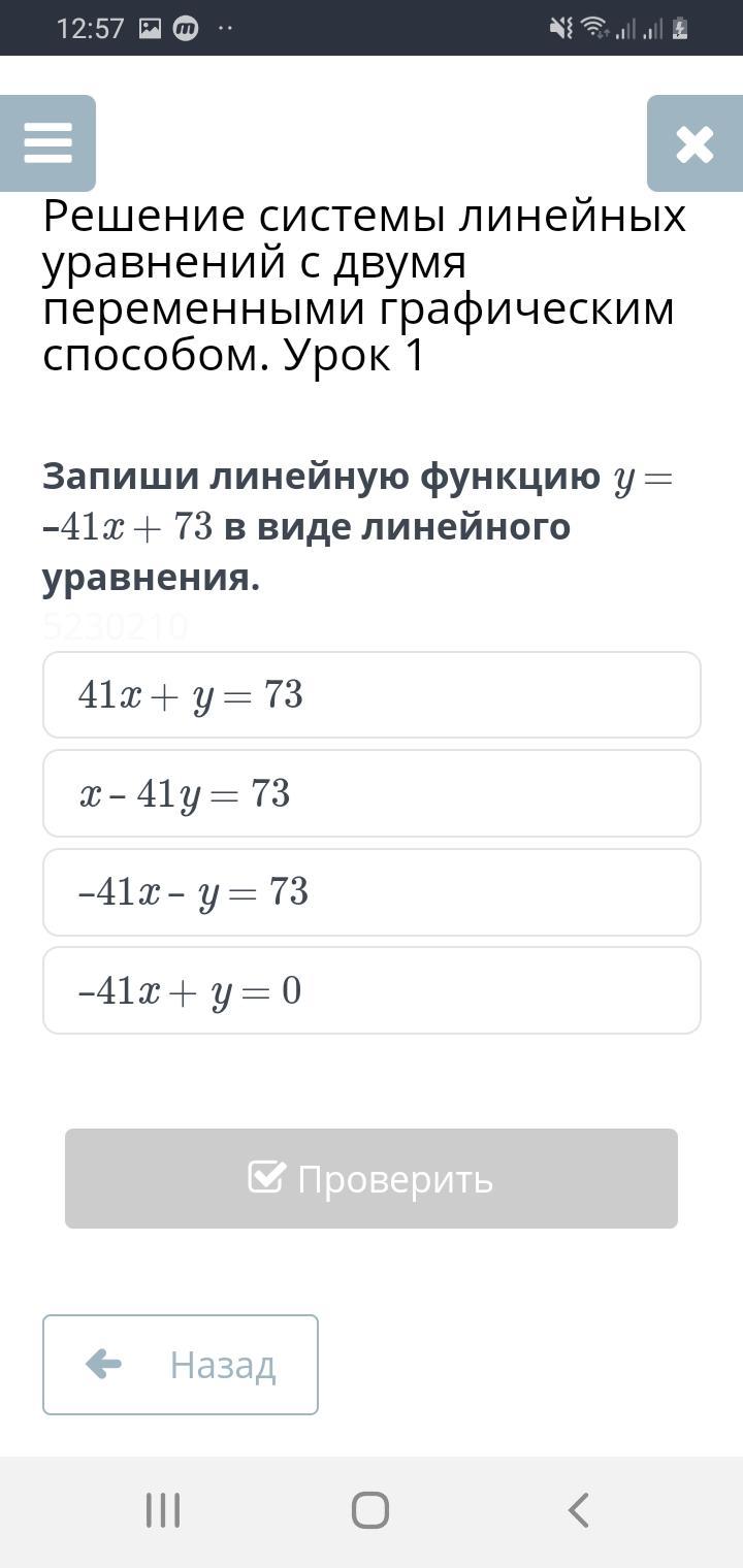 Запиши линейную функцию у=-41х+73 виде линейного уравнения.
