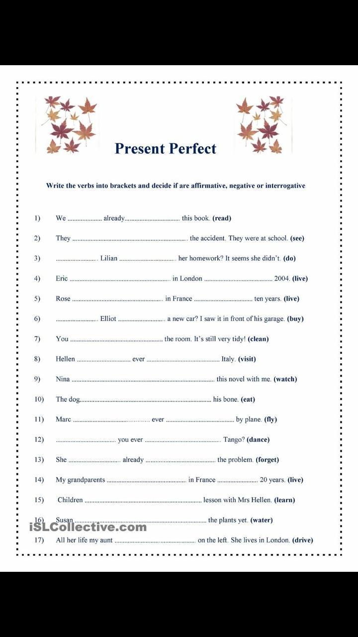 Write the verbs into brackers and decide if are affirmative, negative or interrogative