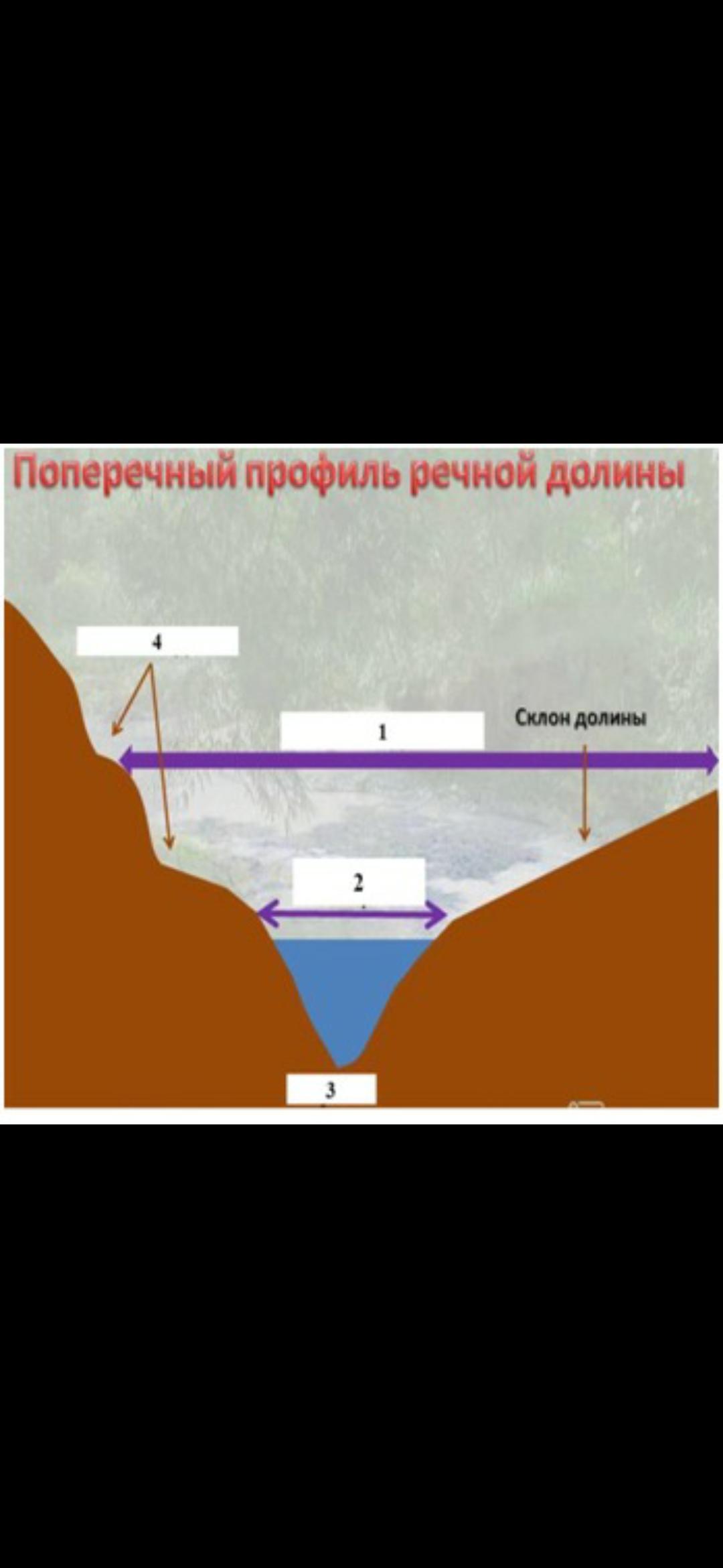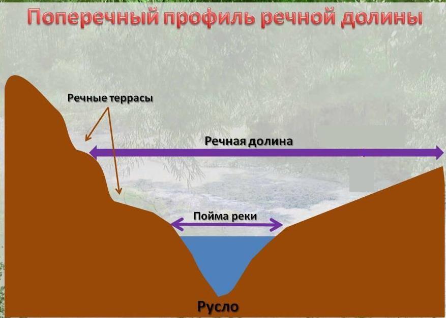 Речная долина состоит из русла (самая глубокая часть речной долины, где протекает река во время минимального уровня воды в реке), поймы (это часть реки, которая затапливается в половодье), речных террас (это наклонные участки речной долины, которые образовались в результате водотока во время разлив реки).
