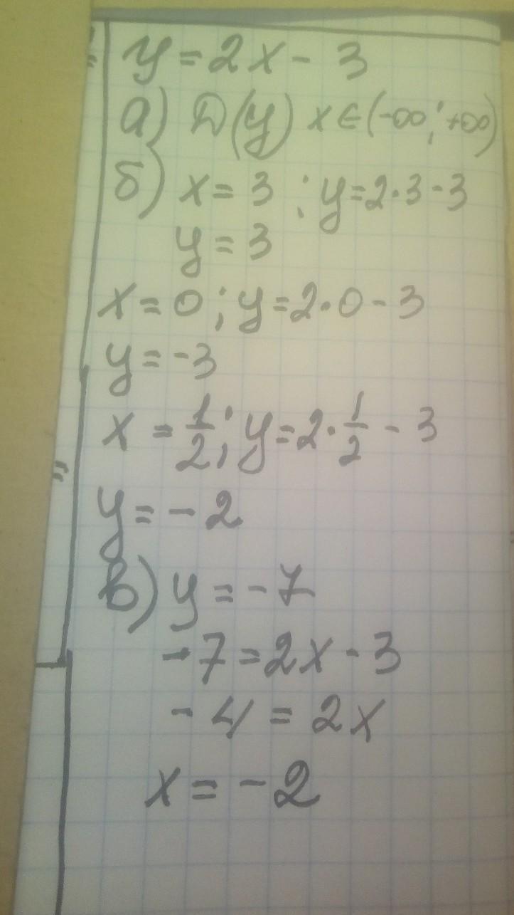Задана функция у=2х-3 a) найдите область определения функции б) найдите значение функции у, если х=-3 ;0; 1/2 ;5 в)найдите значение аргумента х для функции, если у-7