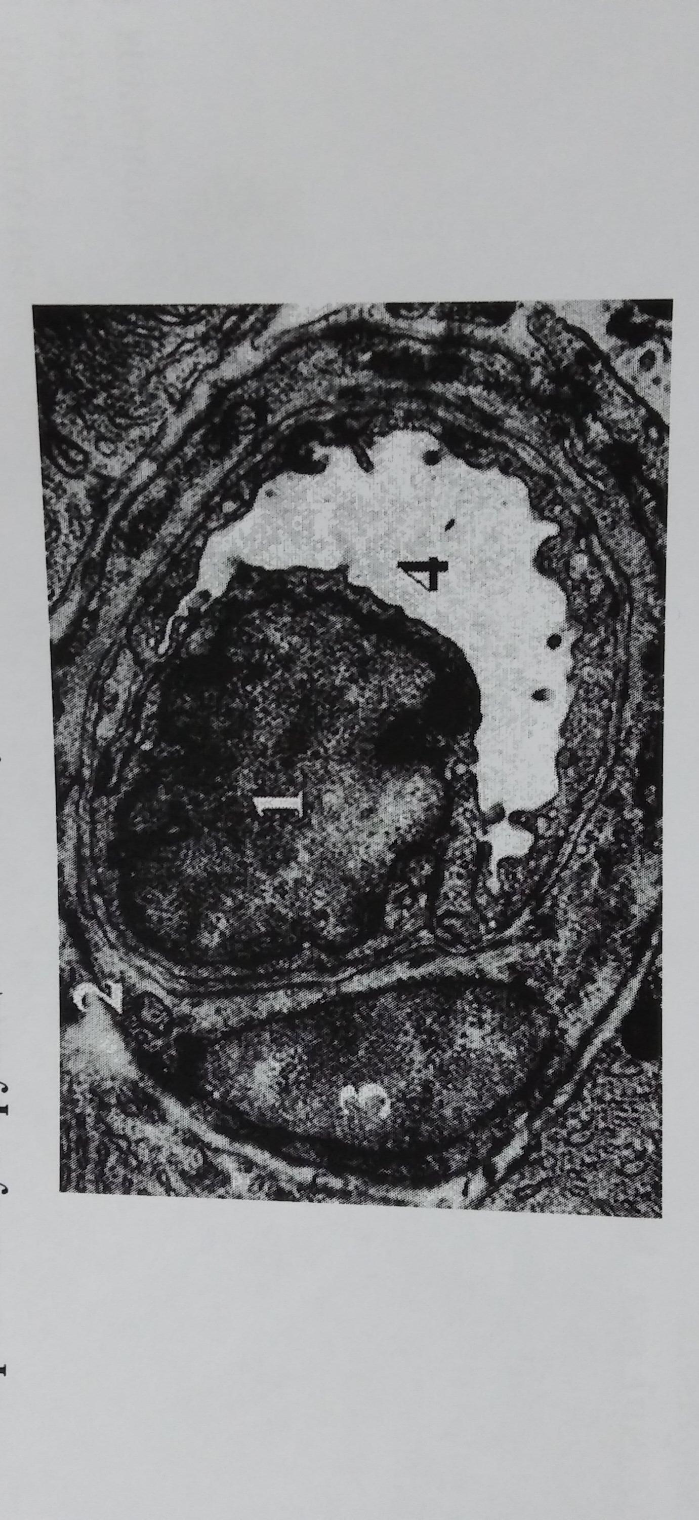 На иллюстрации показан поперечный срез капилляра. 1- ядро клетки эндотелия, 4- просвет капилляра. Клетки, подобные клетке, ядро которой обозначено цифрой 3, выполняют очень важные функции в работе капилляров. Какую функцию НЕ могут выполнять такие клетки?