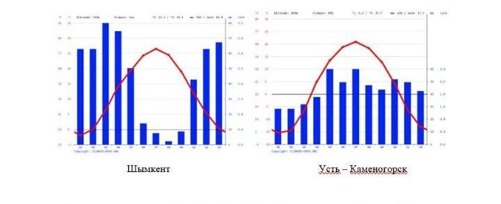 Используя график, определите различия в температурном режиме городов Шымкент и Усть Каменогорска.