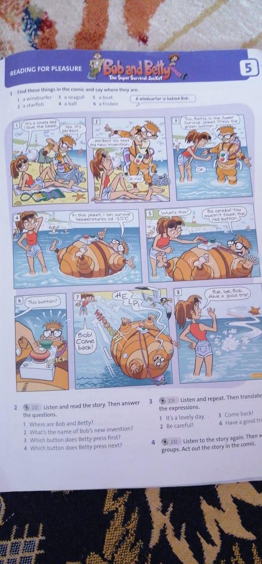 2.12 Listen and read the story. Then answer the questions 1 Where are Bob and Betty? 2 What's the name of Bob's new invention? 3 Which button does Betty press first? 4 Which button does Betty press next? 4