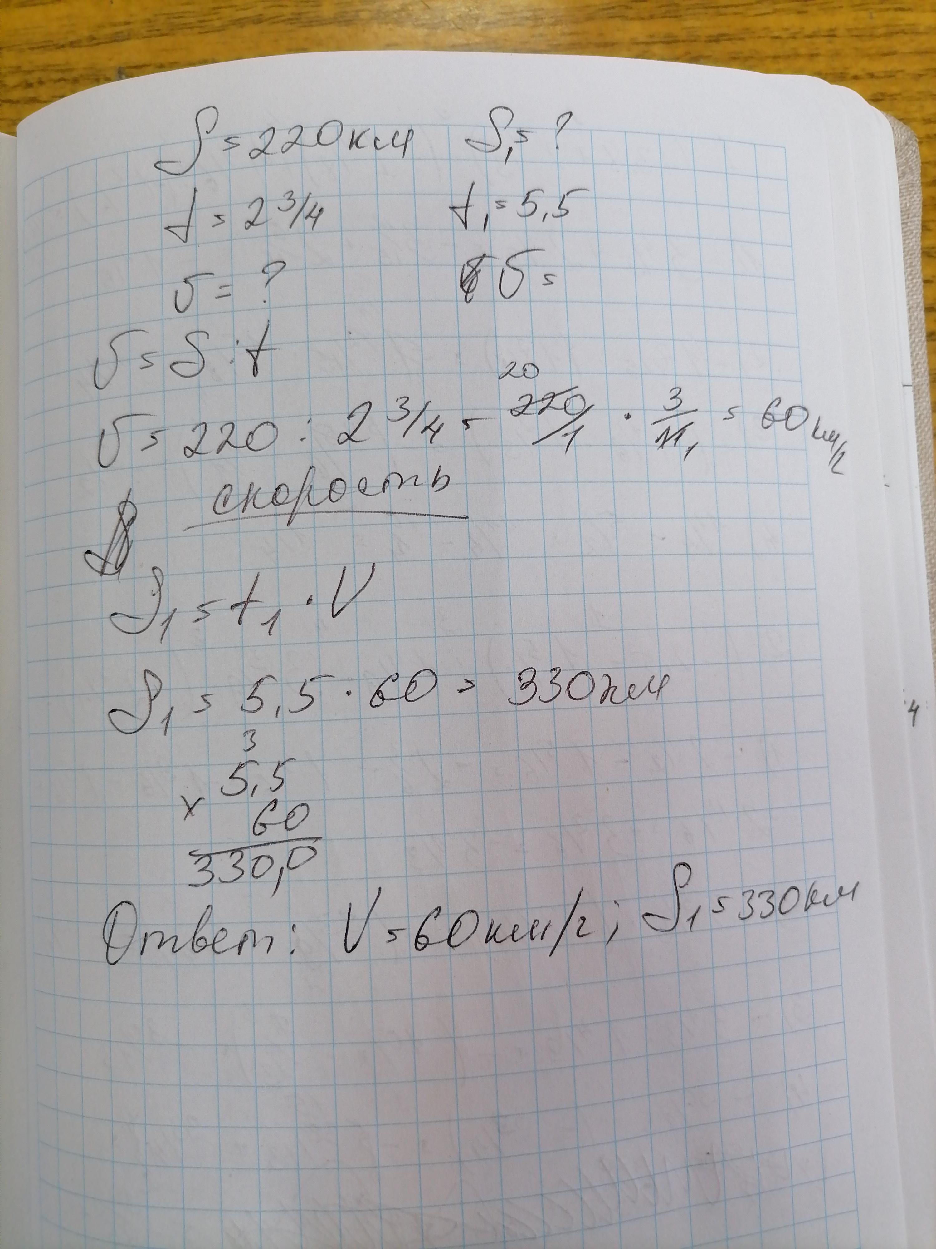1. За 2 ¾ часа поезд прошел расстояние 220 км. Какой путь пройдет поезд за 5,5 ч, если будет идти с той же скоростью?