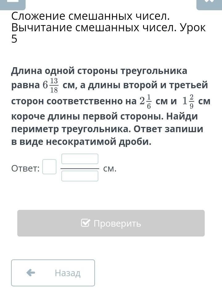 2) 6 13/18 - 1 2/9 = 5 1/2 см - длина третьей стороны.