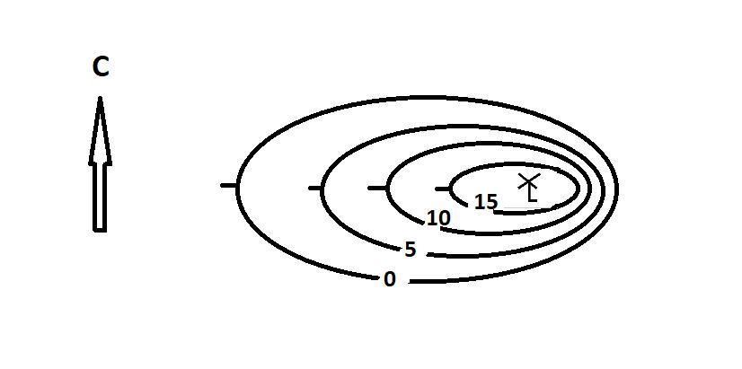 Начертите холм, который вытянут с запада на восток, восточный склон крутой, горизонтали проведены через 5 м, отметка высоты равна 15 м, на вершине ветряная мельница.