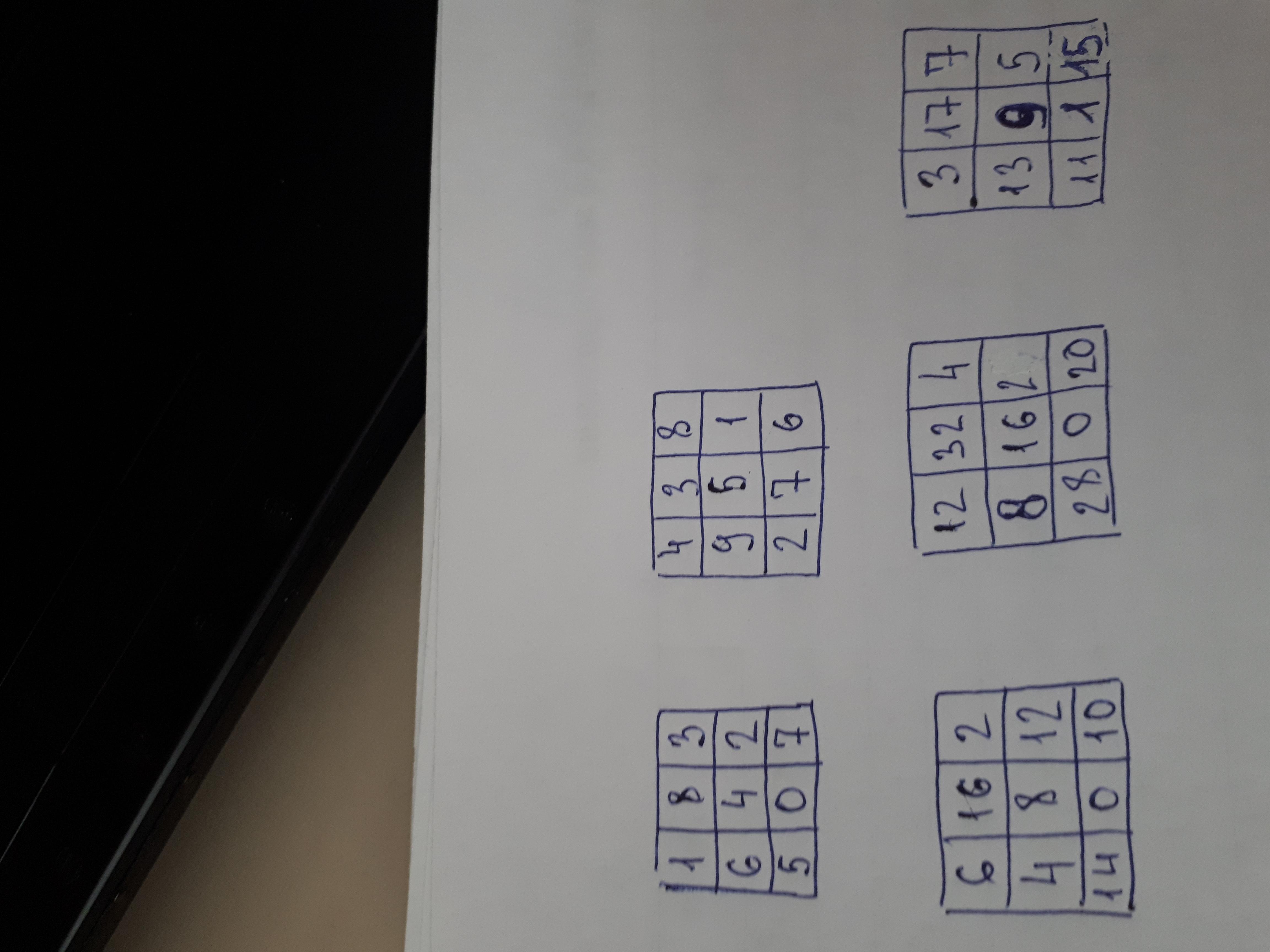 По вертикали, горизонтали, диагонали сумма трех чисел должна быть одинаковой.