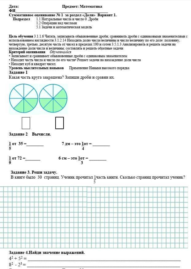 1. 3/8; 5/8; 2. от 35=7; от 72 = 8; от 6 = 6/18 см; от 7 = 7/28; 3.30/30 : 1/5= 6; 4. =16+25= 31; =54-8= 46;