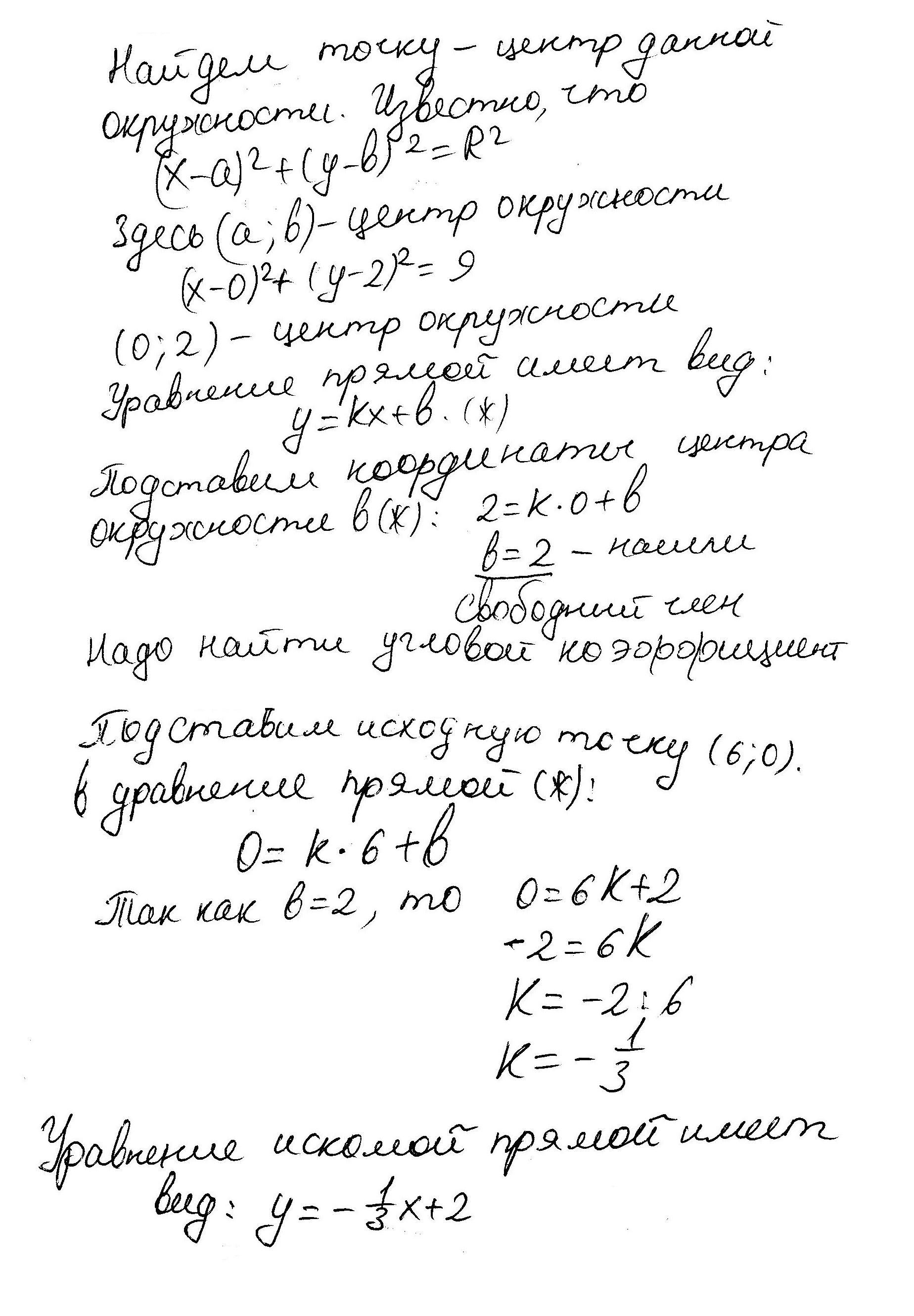 складить ривння прямой яка проходит через точку (6:0) и центр коло , заданого ривння x²+(y-2)²=9