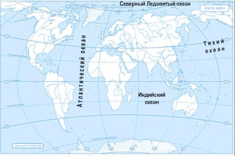 задание 2 На контурной карте найти и подписать океаны: Тихий, Атлантический, Северный ледовитый, индийский