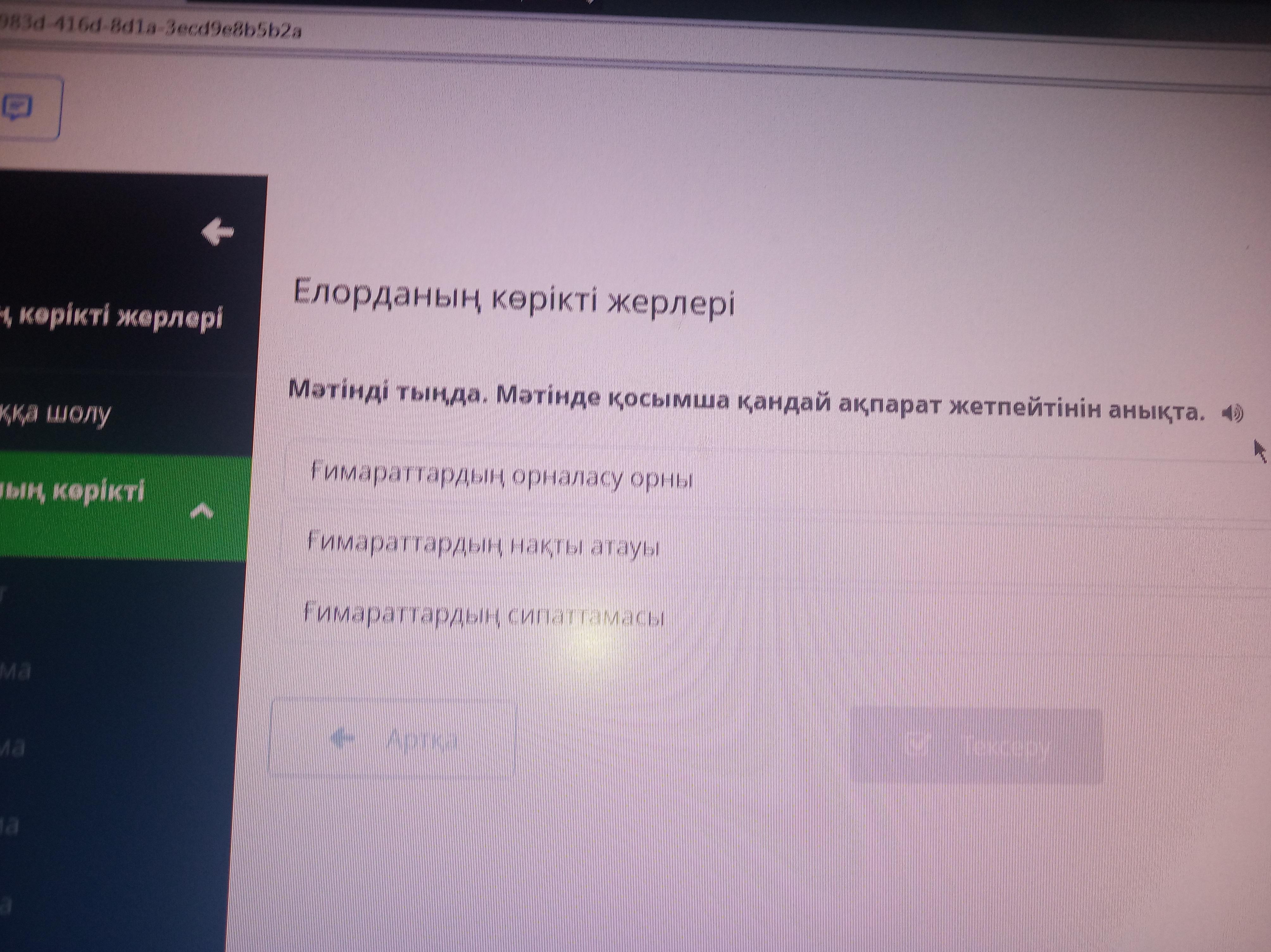 Мәтінді тыңда . Мәтінде қосымша қандай ақпарат жетпейтінін анықта . 4 ) Ғимараттардың орналасу орны Ғимараттардың нақты атауы Ғимараттардың сипаттамасы
