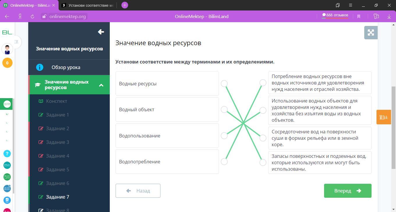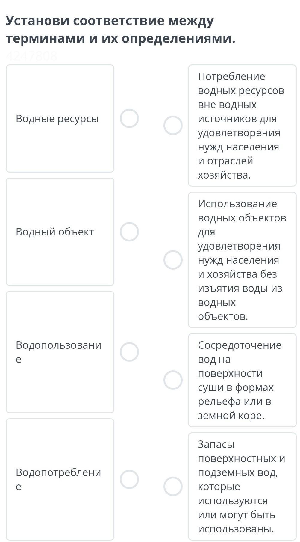 Установи соответствие между терминами и их определениями . Водные ресурсы Потребление водных ресурсов вне водных источников для удовлетворения нужд населения и отраслей хозяйства . Водный объект Использование водных объектов для удовлетворения нужд населения и хозяйства без изъятия воды из водных объектов . Водопользовани e Сосредоточение вод на поверхности суши в формах рельефа или в земной коре . Водопотреблени e Запасы поверхностных и подземных вод , которые используются Или могут быть использованы .