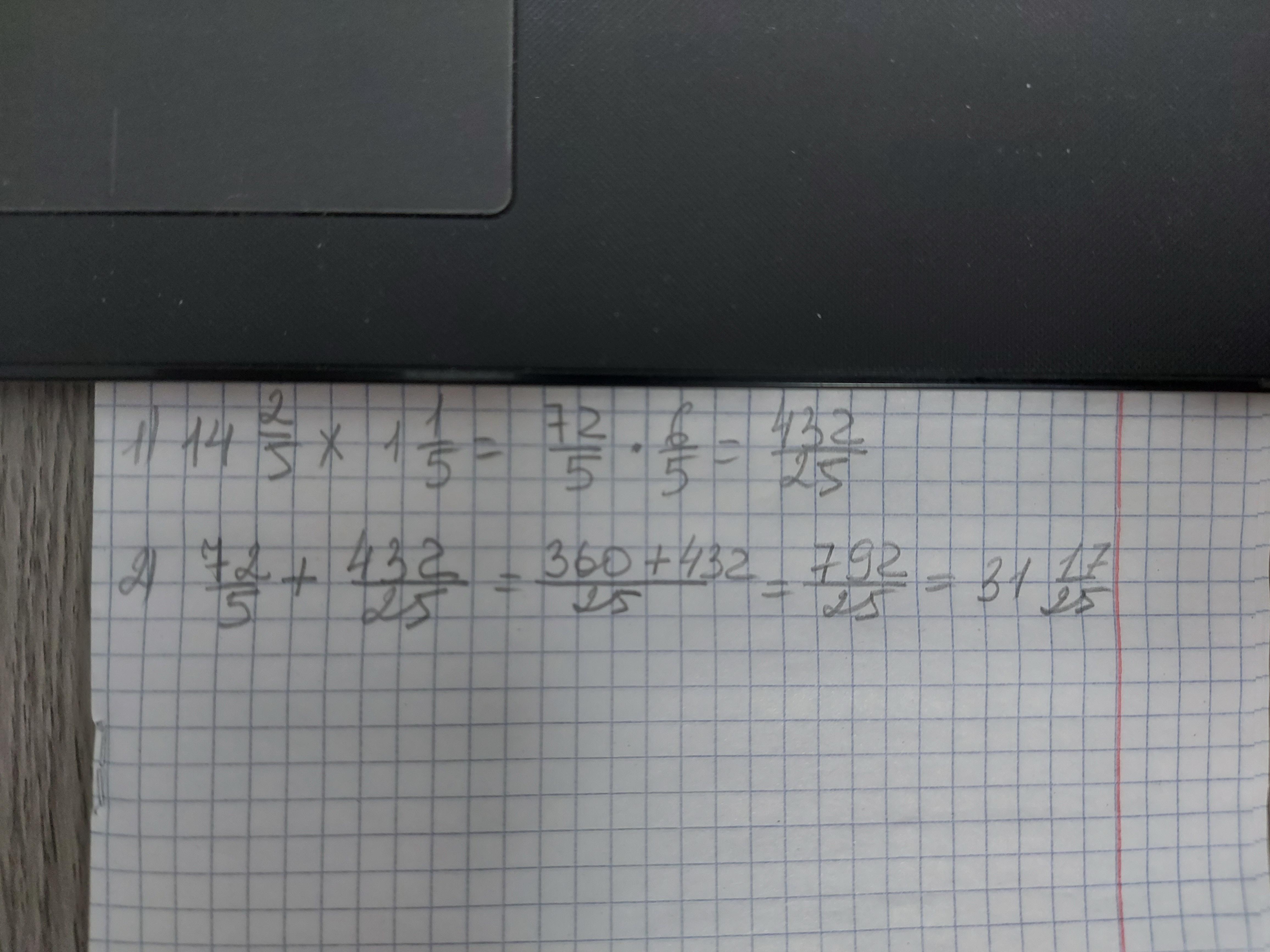 1) 14 2/5*1 1/5= 72/5*6/5=432/25